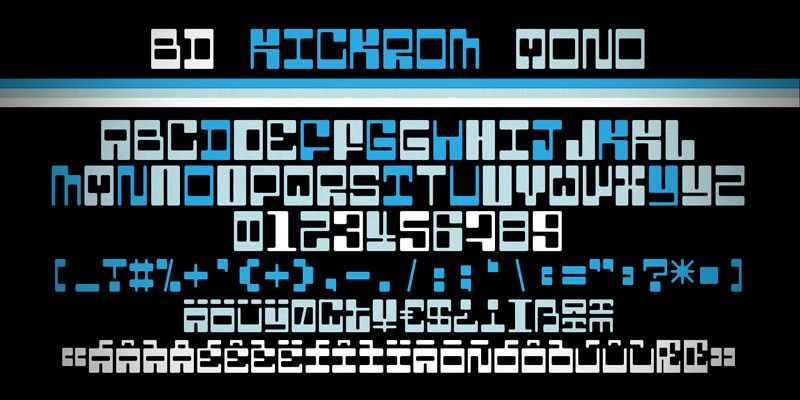 BD Kickrom Mono is a retro futuristic monospaced, uppercase font with variants on the lowercase characters. Designed by Lopetz in 2016.
