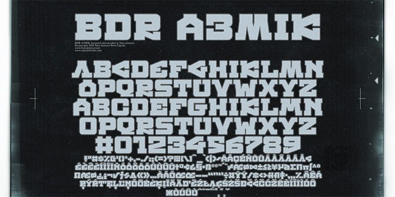 BDR A3MIK is a constructive, futuristic, uppercase alphabet with alternatives including European/Eastern European, Russian Cyrillic and Japanese Katakana characters. Designed by Lopetz in 2009.