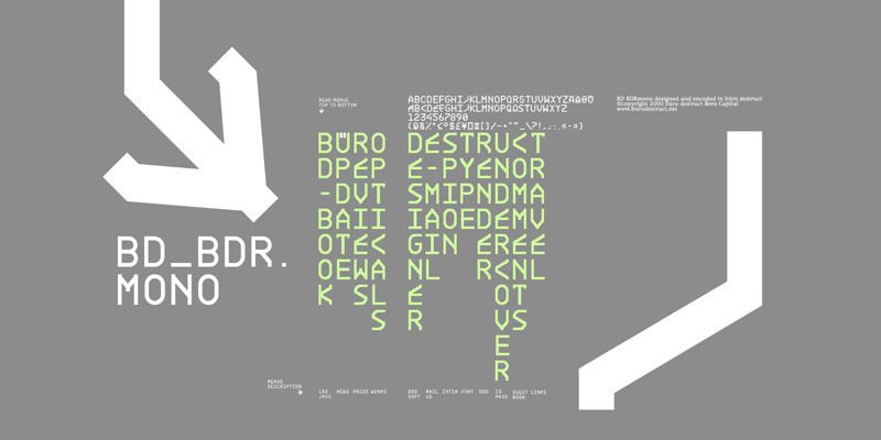 BDR Mono is an uppercase alphabet with alternative characters on the lowercase letters. It contains the three styles: Light, Regular and Bold. Designed by Lopetz in 2006.