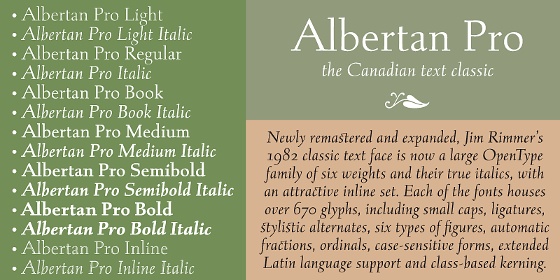 Albertan was the first Jim Rimmer typeface to make the transition from metal to digital. When the first roman face was cut at 16 pt. in 1982, it was intended for use in hand-setting limited edition books at Jim's own Pie Tree Press.
