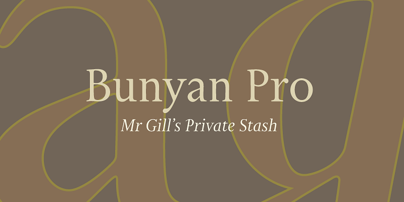 Bunyan Pro is synthesis of Bunyan, the last face Eric Gill designed in 1934 and Pilgrim, the machine face based on it, issued by British Linotype in the early 1950s — the most popular Gill text face in Britain until well into the 1980s.