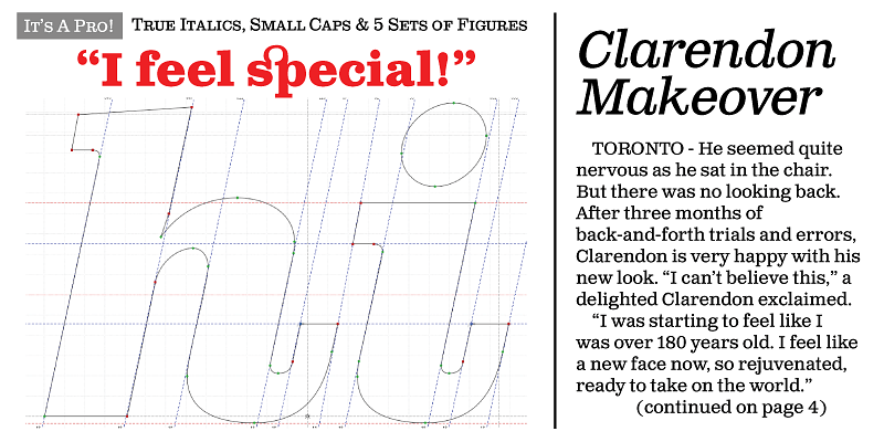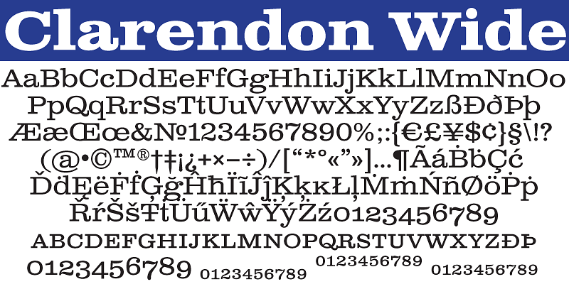 This is the wide display companion to the Clarendon Text family. It comes in ten styles: regular, medium, bold, with small caps and oldstyle figures counterparts, as well as stencil and sketch versions of the regular and the bold.