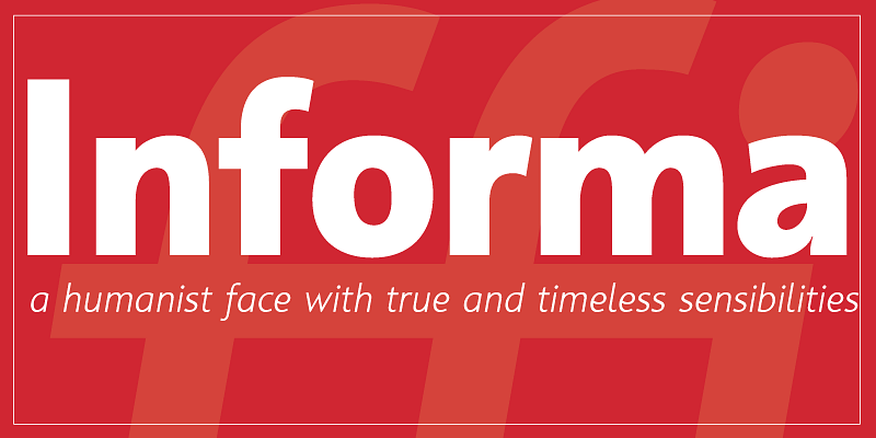 Informa is a comprehensive sans serif based on traditional lettering in proportion, rhythm and stroke. It strikes a visual balance between man and machine by maintaining the equilibrium between the influences that drive the genre.