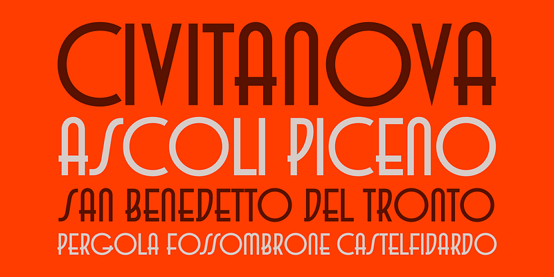 Augusta is an all-caps inline geometric typeface of rather complex construction. Each character has a solid and a shaded side, the latter consisting of a grid of thin parallel lines. It is a prime example of modernist type design, albeit with some letterforms with Art Nouveau traits ( Augusta was a metal type produced by the Fonderia Tipografica Meridionale Armando De Luca (Naples), a family-run type foundry about which very little information is available. It was founded in 1896 and ceased activity in the 1970s or early 1980s, when the De Luca family switched to the manufacture of printing inks. Their greatest success seems to have been Napoli, a sanserif very similar to Schriftguss’s Super-Grotesk. Released in six sizes, from 20 to 72 points, Augusta shares a family likeness with some German inline typefaces which were popular in the late 1920s. Nonetheless, as far as we can tell, Augusta is an original design. In the words of the designer Riccardo Olocco ‘the AM Augusta digital revival is faithful to the original even though many small details have been improved to make the grid construction of the letters consistent throughout the character set. In conformity with modern taste, letter spacing has also been improved and is now much tighter than the original. Some figures have been modified, because their original shapes did not fit well with the others.’ OpenType Features: ss01 – Round E
