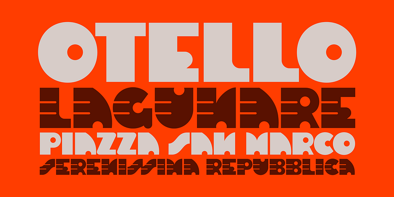 Serie 610 is an all-caps typeface with a striking feature: all letters and glyphs are divided into an upper black half and a lower white half on a black band. In keeping with the Art Deco tendency of the 1930s, the letterforms are based on straight lines and circles. Notable shapes are the round apex of A, the ‘horseshoe’ N, and the vertical tail of Q. Serie 610 was produced as a wood type by Xilografia Milanese (Milan) in the 1930s, and was released in several body sizes ranging from 3 to 40 lines (roughly 36–500 points). We know that the company also manufactured typecases, miniature cabinets (containing cases of different designs of type) and other items for printers. We don’t know when the company was founded, but it advertised in the famous Campo Grafico magazine from 1936 onwards, and closed its offices in 1968. The typeface was offered along with angled, rounded, arrowed, and forked pieces of the band to be placed at the beginning and end of titles of one or a few words. These special sorts – an idea picked up from decorative styles successfully purveyed by 19th-century typefounders – have been reproduced in the digital revival and are available through OpenType features. ‘The AM Serie 610 digital revival – assures the designer, Riccardo Olocco – is very true to the original, with virtually no modified letterforms or glyphs. Each wood letter in the original Serie 610 was produced with a thin white vertical line on the left and right sides, so that a word set in this typeface would have had a thin line between each letter. The repetition of these thin lines creates a kind of visual Larsen effect in the digital environment, and so the letters of AM Serie 610 are now all connected without lines between them. However, a version of the letters with white lines has been included as a stylistic set which can be activated via OpenType features.’ OpenType Features: ss01 – White lines between characters ss02 – Front and end pieces = (e); >e<; \e/; «e»