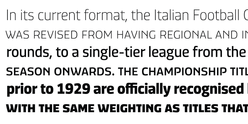 Dic Sans is a square sans serif available in many weights. It looks good on screen and in print. Inspiration came from Novarese’s Eurostile, with wide apertures and a less geometric design.