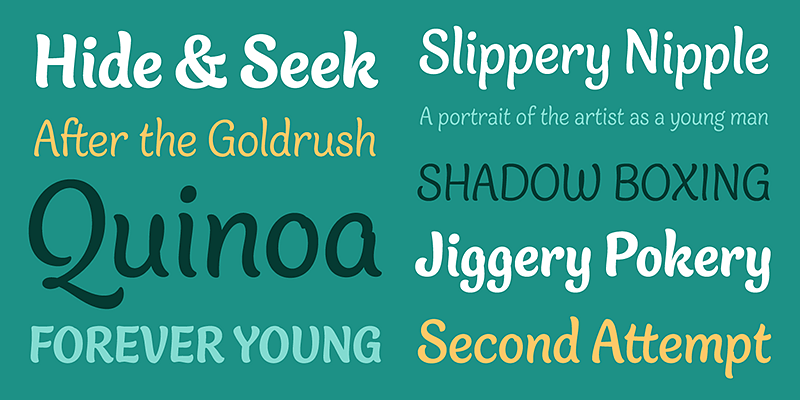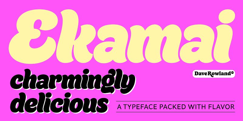 This is Ekamai, a deliciously plump, tight-but-not-touching script. It is named after a district of Bangkok where Dave once lived. With its lovingly rendered curves and just the right amount of cuteness, Ekamai is perfect for food packaging (of the sweeter variety, probably!), logos, magazine headlines, branding, and the like. The overall feel is friendly and soft without being overtly saccharine. Ekamai pairs well with Quinella, a slightly older sibling, in dramatic and exciting ways, too!