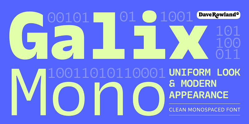 Galix Mono is a monospace font patterned after Galix, a technical sans designed to look futuristic without any of the retro appearance. It has a squarish, slightly condensed anatomy characterized by thin joints and deep ink traps that add a sparkle to the otherwise monoline typeface. In the italics, these cuts are accentuated even more, which creates a sense of speed in the letterforms. Galix Mono is perfect for coding, apps, infographics, and other design situations that require structure.