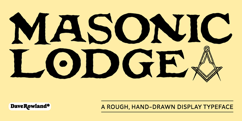 Masonic Lodge is a rough, hand-drawn display typeface that appears to be chiseled from stone. Rowland started with a very low scan and traced it until he had almost a whole alphabet. He saw potential, so he created the rest of the letters into a font. There is variety for more authenticity with two versions of each letter and number. Masonic Lodge would be excellent for pub signs and menus, secret society meetings and rosters, food labels and packaging, and monster movie titles and posters!