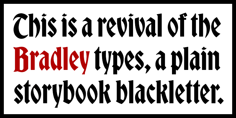 Bradley DJR is a revival of Bradley, a typeface released by American Type Founders in 1895. It is based on Will H. Bradley’s cover for the Christmas edition of The Inland Printer magazine, and most records show that it was Hermann Ihlenburg who completed the typeface design. Its simplified forms make it more accessible to readers who aren’t accustomed to blackletter, and this revival seeks to preserve its softness, descending capital letters, and distinctive storybook character. [DJR's article about Bradley DJR](https://djr.com/notes/bradley-djr-font-of-the-month) For additional license options like app, enterprise, multi-user, and self-hosted web, visit [Bradley on Type Network](https://store.typenetwork.com/foundry/djr/fonts/bradley-djr).