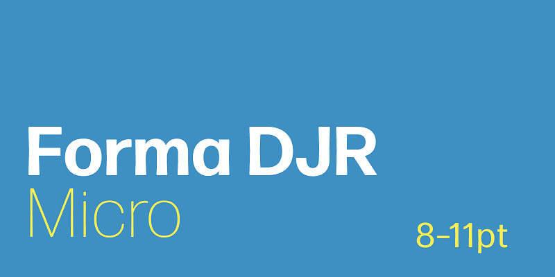 Forma DJR is a revival of Aldo Novarese’s late mid-century neo-grotesque for the Italian Nebiolo foundry. Working together with Roger Black and Indra Kupferschmid, David Jonathan Ross studied the original metal type and interpreted the design as a large family with optical sizes, rounded corners, and tapering stems. The weight range was later pushed to Hairline and Black extremes and reimagined as a variable designspace, with contributions from Ruggero Magrì. [Forma Brochure](https://www.typenetwork.com/brochure/forma) For additional license options like app and enterprise, visit Forma DJR Micro on [Type Network](https://store.typenetwork.com/foundry/djr/fonts/forma-djr-micro).