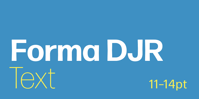 Forma DJR is a revival of Aldo Novarese’s late mid-century neo-grotesque for the Italian Nebiolo foundry. Working together with Roger Black and Indra Kupferschmid, David Jonathan Ross studied the original metal type and interpreted the design as a large family with optical sizes, rounded corners, and tapering stems. The weight range was later pushed to Hairline and Black extremes and reimagined as a variable designspace, with contributions from Ruggero Magrì. [Forma Brochure](https://www.typenetwork.com/brochure/forma) For additional license options like app and enterprise, visit Forma DJR Text on [Type Network](https://store.typenetwork.com/foundry/djr/fonts/forma-djr-text).