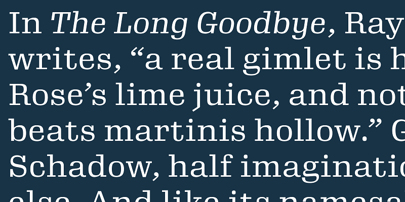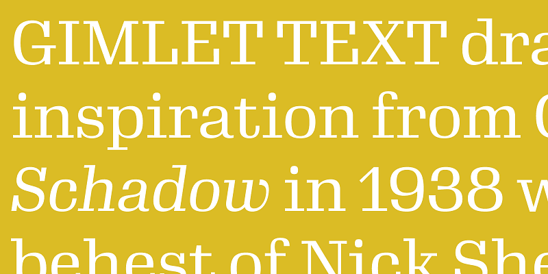 Gimlet draws its inspiration from Georg Trump’s 1938 typeface, Schadow. At the behest of Nick Sherman, David Jonathan Ross reimagined the oddball serif as an energetic contemporary workhorse, complete with three optical sizes and a flexible set of widths tailored for responsive layouts. A multifaceted series that speaks with a singular voice, Gimlet is a rare find: a typeface that is as funky as it is functional. For additional license options like app and enterprise, visit Gimlet Text on [Type Network](https://store.typenetwork.com/foundry/djr/fonts/gimlet-text).