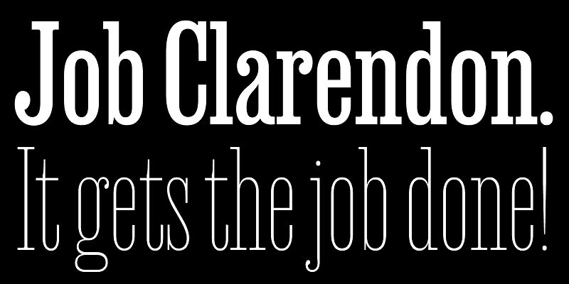 Job Clarendon is an homage to ‘job printing’ and the Condensed Clarendons used in posters and flyers in the heyday of letterpress printing. A collaboration between David Jonathan Ross and Bethany Heck, this interpretation focuses on the style’s adaptability, taking it both thinner and heavier than most of its nineteenth-century exemplars dared to go. Throughout this expansive range, Job Clarendon maintains its dense charm, with chunky slab serifs, ample ball terminals, and square-terminal alternates. [DJR's article about Job Clarendon](https://djr.com/notes/job-clarendon-font-of-the-month) For additional license options like app, enterprise, multi-user, and self-hosted web, visit [Job Clarendon on Type Network](https://store.typenetwork.com/foundry/djr/fonts/job-clarendon).