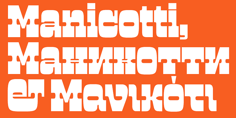 Inspired by the boisterous wood types of the nineteenth century, Manicotti pushes the reversed-stress French Clarendon style to its decorative extreme. Its thick tops and bottoms and massive slab serifs create an oddly dense typographic texture that is reminiscent of Spaghetti Western films, rugged trails and rowdy saloons. For additional license options like app and enterprise, visit Manicotti on [Type Network](https://store.typenetwork.com/foundry/djr/fonts/manicotti).