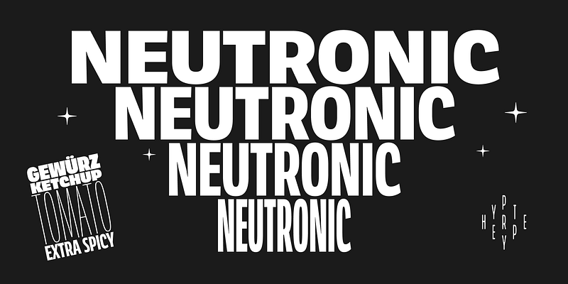 Neutronic is sure to make a lasting impression on your designs. With a weight range from very thin to heavy, it's not only one of the boldest fonts but also one of the most versatile. Its broad width palette, covering compressed and normal, provides endless design options that are perfect for capturing your brand's personality. The compressed family is more organic and soft than most other condensed typefaces, adding a touch of personality and character to your designs that many other condensed fonts fail to achieve. Designed to seamlessly integrate across all design platforms, it's incredibly useful for branding animations and UI design. Its vertical metrics are carefully crafted to make text sit perfectly in buttons and align harmoniously with icons. Supporting 222 languages, Neutronic is the ideal font for mutli-language use and corporate design. You can be confident that your designs will not only look great but also communicate effectively to a global audience. Use Neutronic to create designs that stand out from the masses.