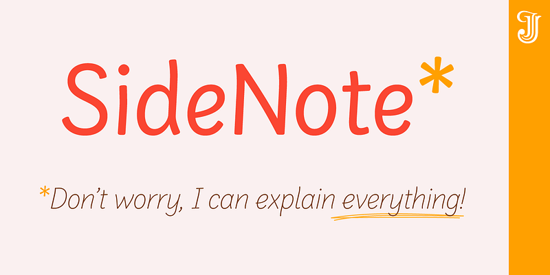Hello! I’m SideNote. I specialize in annotations, headings and friendly dialogue. I’m perfect for descriptions and explanatory text. Use me to deliver tricky information in a helpful, reassuring manner. I look friendly and relaxed but professional enough to make you look awesome. I add personality to otherwise dry information making it fun and easier to understand. Whether you’re pulling some slides together or explaining your work, think of me as your friendly assistant I come with all sorts of useful features, like emoji, arrows and underlines. [ For additional license options like app and enterprise, please visit: [Jamie Clarke Type](http://www.jamieclarketype.com/).
