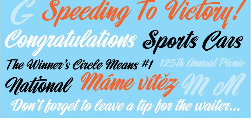 Dragster Script (formerly known as Raceway) is another script font inspired by the work of sign-painter, Mike Stevens and one of my personal favorites. To add typographic variation and a more hand-lettered feel, Dragster Script contains three versions of each letter, plus a few additional alternates and ligatures to round out the glyph set. Full of energy and fun, this font is perfect for a variety of designs! Mixing and matching these variations gives your design a more organic feel. I enhanced the bouncy mood of this typeface by slightly modulating the baseline. Dragster Script is a great font with terrific versatility.