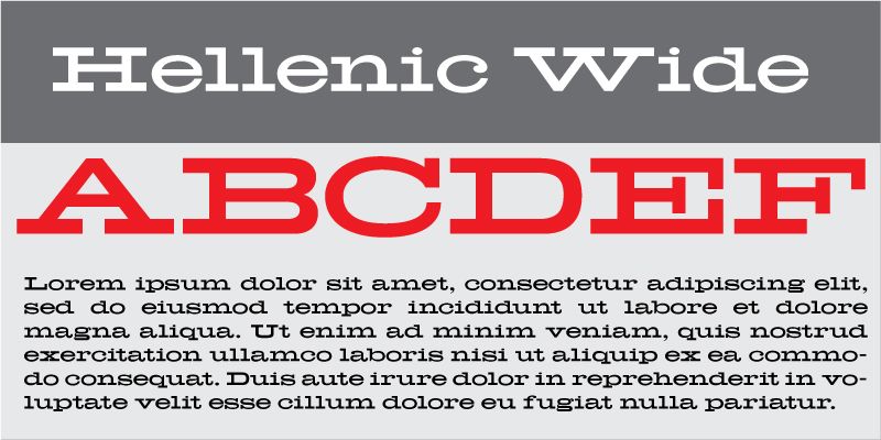 Hellenic Wide is a slab serif typeface digitally revived for the Jukebox library from the ATF original. It's strong horizontal letterforms give it a classic mid 20th century look.