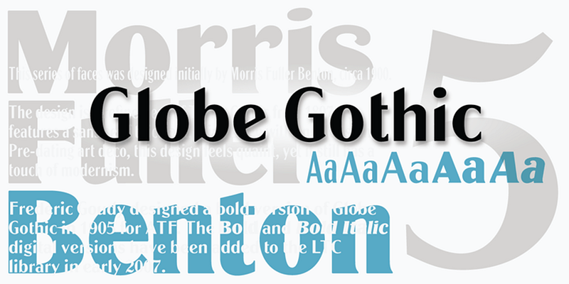 LTC Globe Gothic is a refinement of Taylor Gothic redone by Morris Fuller Benton in the early 1900s. Frederic Goudy designed the bold for Globe Gothic in 1905. This design feels quaint, yet modern.