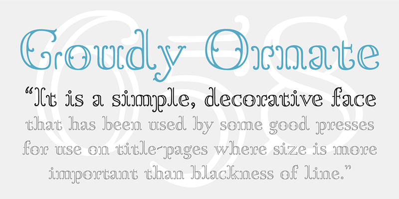 LTC Goudy Ornate was designed in 1931 by Frederic W. Goudy. This new Lanston digital version includes a lower case and full character set designed in the style of Frederic W. Goudy.