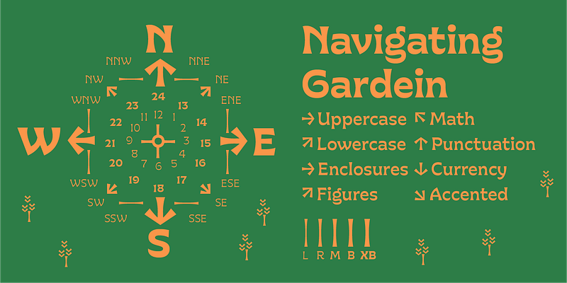 With unconventional humanistic quirks, Gardein’s letterforms cultivate a striking texture on or off the page. Built on a Roman foundation, the concave stems are adorned with flared terminals and extra weight on the x-height and baseline, creating a fresh, organic flavor for headlines, short texts, and eco-friendly brand messaging. The family includes five weights, from Light to Extra Bold. Gardein takes inspiration from the beautiful book cover design work of Sarah W. Whitman (1842-1904), an American stained glass artist, painter, and designer with an aesthetic influenced heavily by the Arts and Crafts Movement. Gardein is also available as a variable font and can be licensed directly from the foundry. Gardein was designed by Christopher Caldwell © 2024 with Troy Leinster.