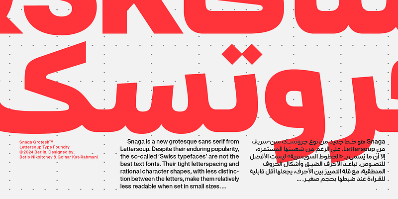 Snaga Grotesk broadens its horizons linguistically, as it now supports Arabic, and artistically, thanks to the addition of exciting unicase variants for Latin, Greek, and Cyrillic. While the presence of decorative elements makes most Arabic fonts look quite playful, Snaga Arabic aims to be a highly readable and reliable voice for serious interactions with the reader. Designed in collaboration with Berlin-based Iranian designer Golnar Katrahmani, it is a dynamic Arabic with a subtle reverse contrast. The typeface judiciously combines open and closed forms to achieve optimal readability in smaller type sizes. One of its primary goals was to have the original Snaga and the Arabic complement mix seamlessly so that Latin words don’t stand out in Arabic text. By introducing Snaga Grotesk’s characteristic shapes and curves into the Arabic script, Snaga Arabic turned into an ‘Arabic grotesk’, a rare, valuable style in the typographic landscape. Use Snaga Arabic to project stability and confidence.