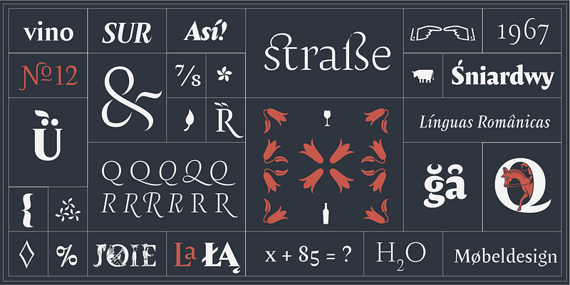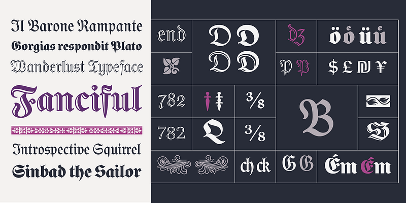 Mexican type designer José Manuel López Rocha, in his exploration of old books, found and fell in love with this Schulfraktur, a traditional blackletter that was commonly used to compose school books in 19th century Germany. In his interpretation, on the one hand faithful to the original style and on the other hand executed with impeccable drawing, this Schulfraktur (baptized “Gorgias” after the title of the book where he first found it) added new glyphs, irresistible ornaments and even a complete set of initials of the time, all of which contribute to a proper staging of this very bookish German type style. Gorgias includes 4 versions, Regular and Black in solid and open forms. This unique typeface is intended for designers of conviction who like to captivate their readers by combining classic and contemporary elements in a special way.