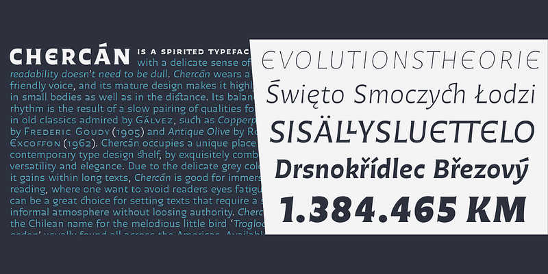 Chercán is an elegant, highly readable, relaxed typeface, making it a good choice for informal settings. Chercán was conceived for immersive reading, with strong, open letterforms and generous counter shapes. It communicates certitude with a subtly charming tone. Its tiny serifs help build an enjoyable reading experience, certainly when compared to that of a sans serif. Chercán has a positive personality, and its whims can add spiciness to headings, logos, packaging, and big bodies in general. In 2021, a complete polytonic Greek version was added to the original Latin extended. For additional license options like app, enterprise, multi-user, and self-hosted web, visit [Chercán on Type Network](https://store.typenetwork.com/foundry/pampatype/fonts/chercan).