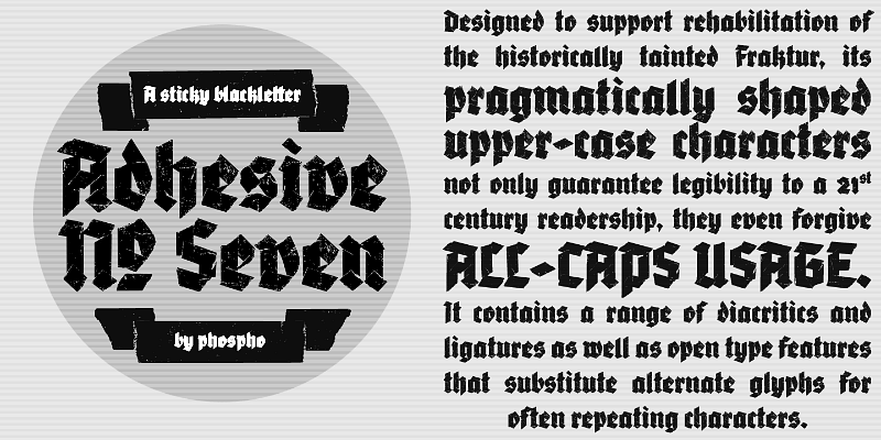 A contemporary blackletter "tapeface", based of the structure of torn adhesive tape. With its fine texture and overlap details you may best use it at poster and headline sizes.