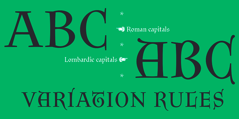 Litania was inspired by a transitional form of Carolingian minuscules. It has two mixable and interchangeable sets of uppercase letters, Roman and Lombardic Capitals.