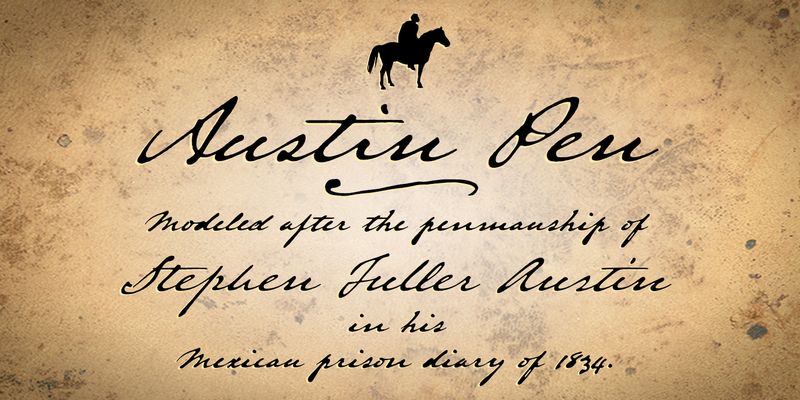 Austin Pen™ replicates the hand of Stephen F. Austin in his famous 1834 Mexican prison diary. Has a regular style and a bold that that seems applied by over-inked pen. Nearly 1,200 glyphs in all.