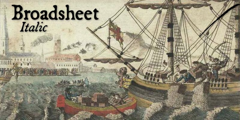 Broadsheet™ is modeled after the type in Colonial American newspapers. Its roman and italic styles have scores of ligatures, true small caps, a few printer’s ornaments, and full Latin support