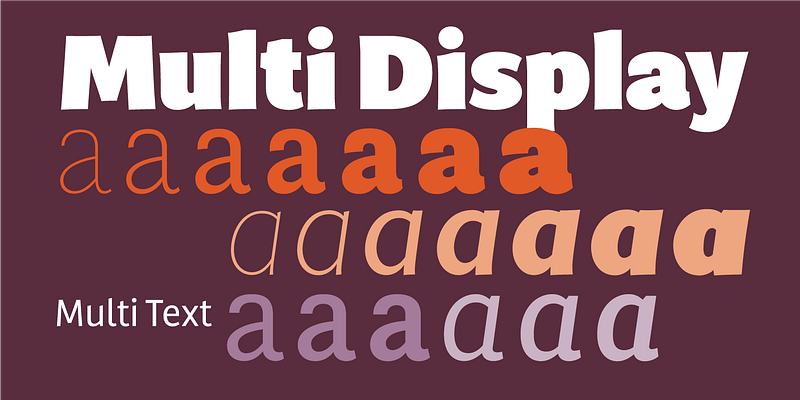 Laura Meseguer’s first extensive type family, Multi was originally commissioned in 2011 by a publisher of Dutch regional newspapers. The aim in developing Multi was to match the serif typefaces used for a comprehensive layout overhaul project supervised by editorial art director Luis Mendo. Keywords provided by the client were unequivocal: warm, dynamic, optimistic, friendly, and human. Meseguer initially designed two series: Multi Text, with two weights in roman and italic, and Multi Headline, with six roman styles. Since that commission, Meseguer has considerably expanded the character set and family. Multi Text now comprises three weights (roman and italic), and Multi Headline was renamed Multi Display (seven weights in roman and italic). Like most Meseguer typefaces, Multi is bursting with vitality. Its distinctive phrasing lies between humanist and glyphic, exploring uncharted territory. The design is pragmatic, yet not rigid, and gently graced with tiny incised touches; Type-Ø-Tones 2016 For additional license options like app and enterprise, visit Multi Display on [Type Network](https://store.typenetwork.com/foundry/type-o-tones/fonts/multi-display).