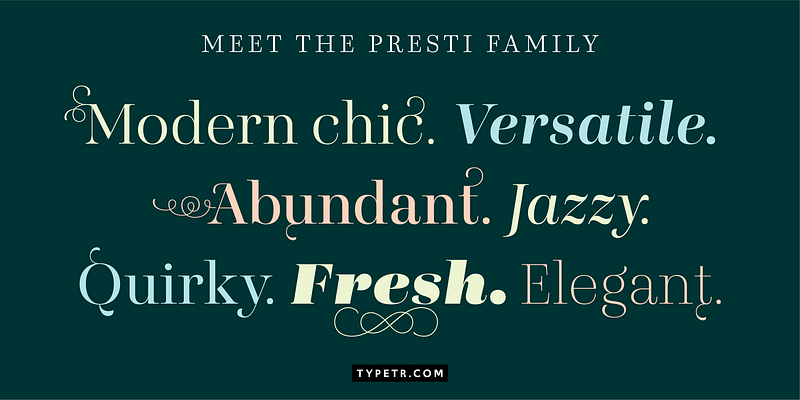 Presti is basically constructed as “expansion contrast," as written with a sharp-nib pencil. The classic appearance is emphasized by the many Open Type features (such as a choice of figures and small caps) and the extensive set of floating flourishes. These can be attached to most letters on eight different positions, two directions, and five sizes. In the Open Type stylistic set a range of predefined flourish settings can be selected, but the user can create any other combination using a simple set of codes. Presti comes in a wide range of weights, classic Roman, and romantic italic. For additional license options like app, enterprise, multi-user, and self-hosted web, visit [Presti on Type Network](https://typenetwork.com/type-foundries/typetr).
