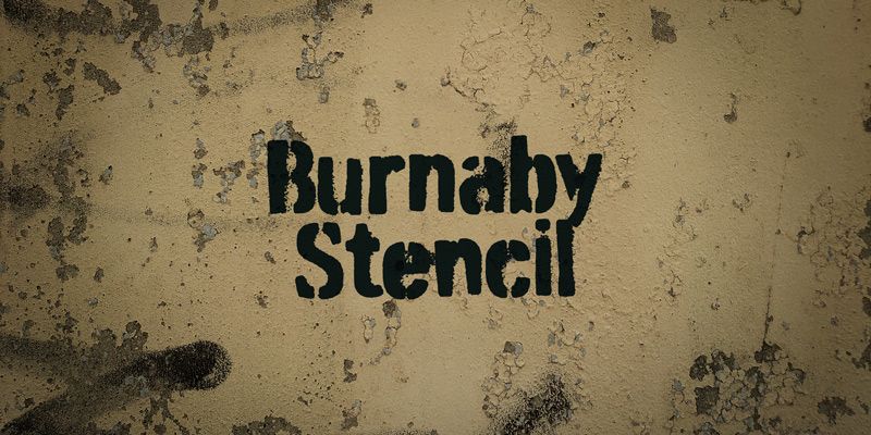 Burnaby Stencil is an oversprayed headline typeface. In OpenType savvy applications, custom letter pairs are automatically substituted for a more natural looking effect.