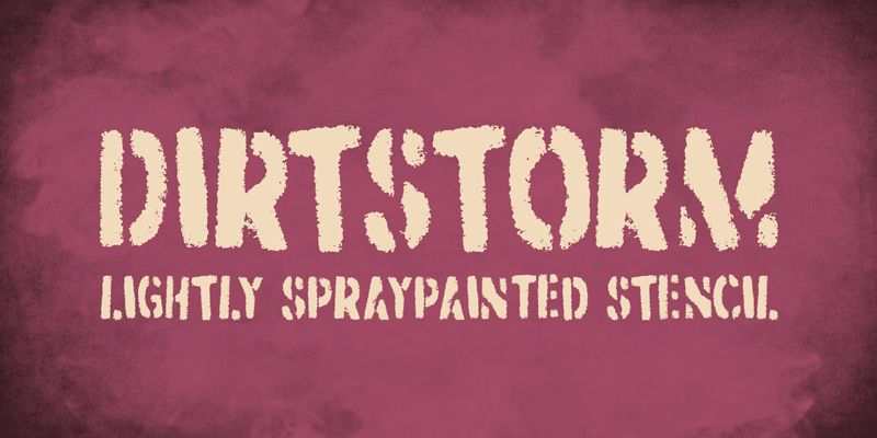 Dirtstorm is a lightly spraypainted stencil font. In OpenType savvy applications, letter pair ligatures help break up the monotony of obviously repeating letters.