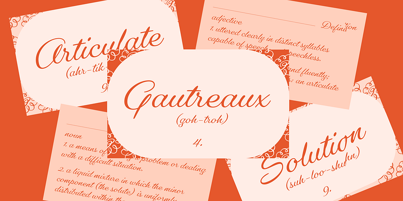 With her third release on Type Network, Victoria Rushton returns to her first typographic love: script lettering. As she worked on what would eventually become Gautreaux, she wondered whether the usual niceties that tend to accompany connected script faces in the age of OpenType—tons of ligatures, tons of alternates—were really necessary. She decided to tone down the design. By drawing and redrawing lettershapes and carefully considering connections in every single combination, Rushton came up with a connecting script that only needs four alternates. Victoria Rushton, 2017. For additional license options like app and enterprise, visit Gautreaux on [Type Network](https://store.typenetwork.com/foundry/victoriarushton/fonts/gautreaux).