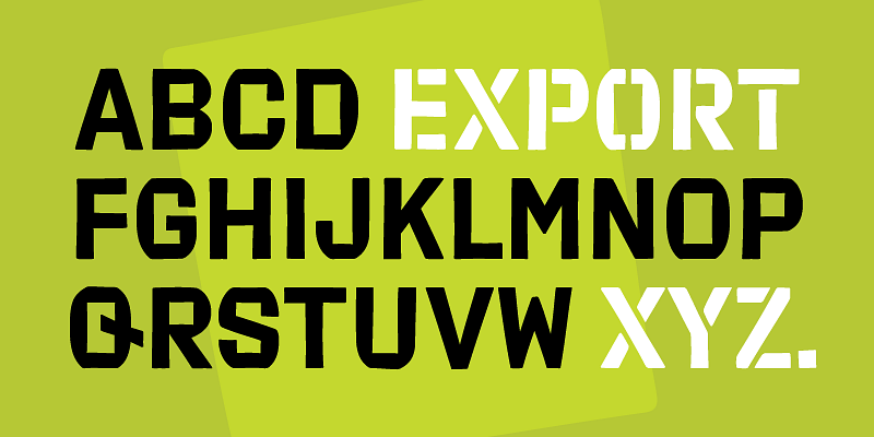While walking around New York City one day, Jesse Ragan happened upon a string of unconventional letters bluntly printed on the side of a cardboard shipping box from a hand-carved flexo plate. The letters’ original creator is unknown, but Jesse decided to pay homage to the unpretentious forms via an all-caps typeface, in Regular and Stencil versions, that preserves the brawn and bite of its analog inspiration. A system of bulges and pinches underlies Export’s irreverent internal logic. Rough edges lend a soft finish to the face’s blocky heft. Eccentric shapes command attention when isolated, but an industrial rhythm takes hold in chunks of text. Export Stencil turns the playful concept of the original on its side, with a network of breaks that are at once pragmatic and illogical. Although a collection of shipping caution symbols are enclosed, this is one durable package. -------- Download the PDF [here](https://xyztype.com/uploads/300003/1493599113462/XYZ_Type_Export.pdf)