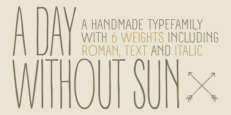 A Day Without Sun is an ultra-condensed version of Panforte, created by Cosimo Lorenzo Pancini on the original design by Debora Manetti. Hand drawn in easy big strokes, it's an extremely condensed typeface that allows you to typeset text in faux-handmade fashion, with the subtle elegance of vintage hand lettered menus. Lovers of world cuisine will be delighted to discover that this typeface supports over forty languages using the latin alphabet, spiced with hand-picked diacritics and it also comes with a tasty side dish of greek and cyrillic glyphs. Its grungy, handmade details are visible at medium and high point sizes but do not impact the effect of the font when set in text. A Day Without Sun OpenType features include small case characters, oldstyle numerals and a series of ligatures that help keep the distinctive handmade look (they can be switched off by unchecking the “standard ligatures” option in your design software).