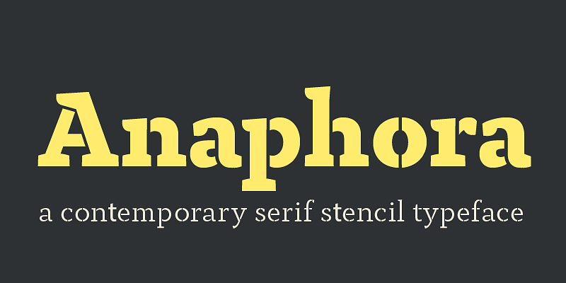 Anaphora is a contemporary serif typeface designed by Francesco Canovaro with Cosimo Lorenzo Pancini and Andrea Tartarelli. It features nine weights, from thin to fat, each with true italics style, for a full range of editorial and advertising uses. Its wide counters and low x-height make it pleasant and readable at text sizes, while the uncommon shapes make it strong and recognizable when used in display sizes. Four additional stencil weights provide options for fancy titling and logo creation. Anaphora features an extended character set that covers over forty languages using the latin alphabet, as well as Greek and Russian Cyrillic. Open type features include small caps, four sets of figures, fractions, superior & inferior figures, alternate forms and discretionary ligatures.