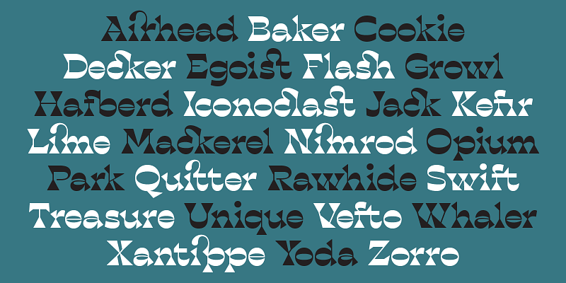 Blackest is an inverse contrast wedge serif typeface family, designed by Francesco Canovaro and Andrea Tartarelli as a development of the design space of Blacker typeface, designed by Cosimo Lorenzo Pancini. It keeps the classical skeleton and sharp edges of the original, while bringing the contrast of the typeface into the realm of the so-called "Italian" or reverse-contrast typefaces. The result is a typeface family that manages to be quirky yet classical, and at the same time playful without losing elegance. With its exuberance and six weights characterized by eye-catching proportions, Blackest is perfect for display use, such as in editorial & magazine design, poster design and logo development. A text variant in two weights, with less contrast, looser spacing, and high readability, has been developed for typesetting of longer texts. Blackest features an extended character set that covers over 220 languages using the Latin alphabet, as well as Russian Cyrillic. Open Type features include small caps, positional figures, alternate letter forms, stylistic sets, arrows and extra punctuation and discretionary ligatures.