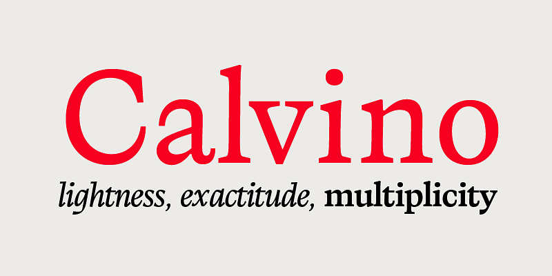 In designing the Calvino typeface family Andrea Tartarelli set himself the challenge to follow the principles expressed by the italian writer Italo Calvino in his masterpiece Six memos for the next millenium. Exactitude and visibility are translated typographically through the reference to sixteen century garalde typography and its controlled, highly legible letterforms. To balance this formal rigour, lightness and quickness were added by letting the design be inspired by the calligraphic hand, following the lesson of Gudrun Zapf. The idea of multiplicity was kept central, developing Calvino in a range of weights encompassing both display and text use cases, and then expanding the design space with the inclusion of a display sub-family, Calvino Grande, to provide users with a full typographic palette to cover all editorial needs. Sharing the same formal structure, Calvino Grande sports condensed proportions, sharper details and tighter metrics. Both Calvino and Calvino Grande are complemented with a set of italic letterforms, with differences in design and slant to better work at different point size. All the 34 weights of the Calvino family come with an extended latin and cyrillic charset, covering over two hundred languages, and all equipped with a wide range of open type features including positional numerals, alternate forms, and stylistic sets. Four variable typefaces are also included in the full package, for any need of fine-tuning the typeface grade of weight. Special thanks go to Laurène Girbal for the help in developing the regular weight.