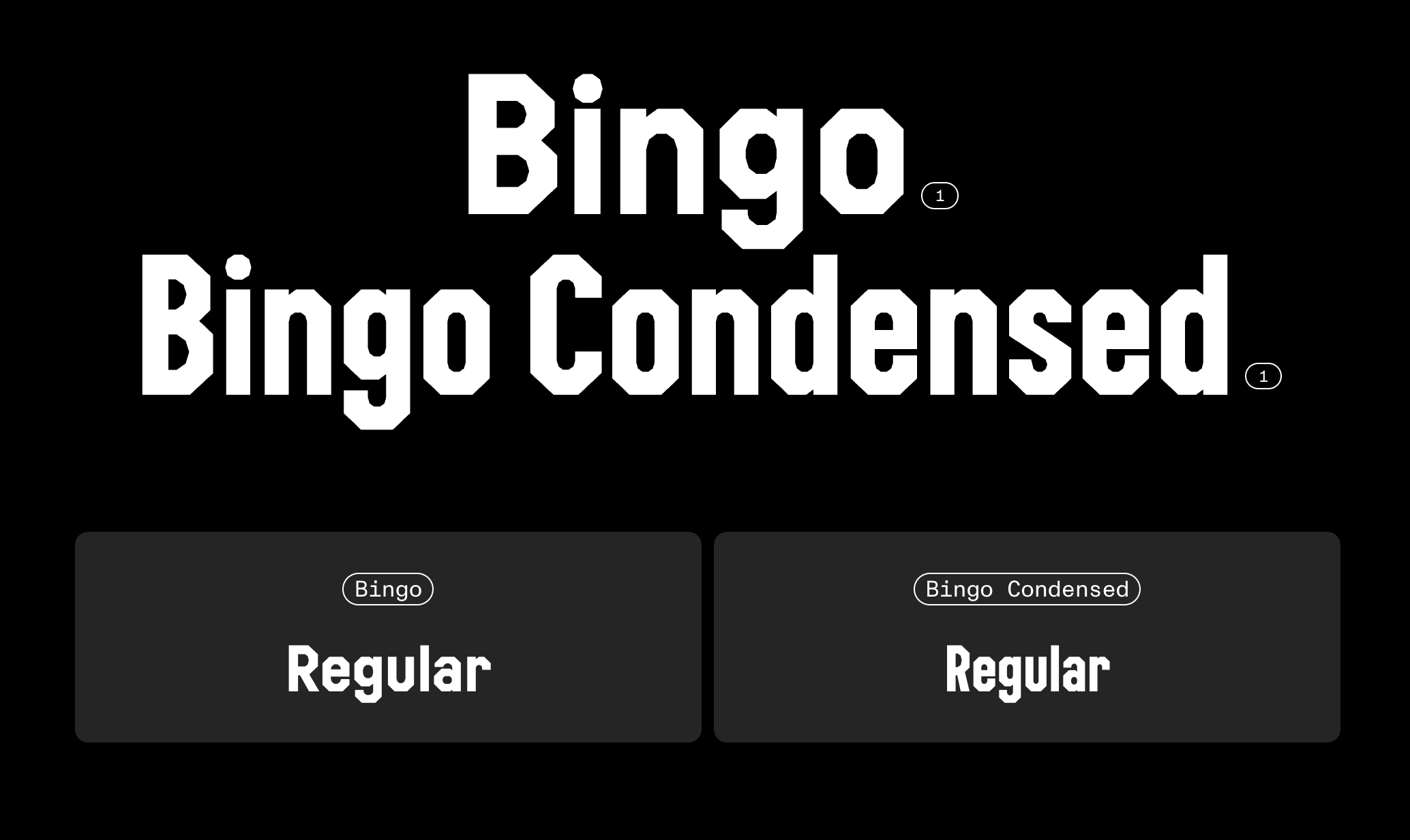Just like the club bouncer that secretly keeps tiny birds as pets, ABC Bingo is rough on the outside and soft on the inside—its edgy exterior contrasts with its sympathetic, rounded inner-contours. The typeface was Johannes Breyer’s first hit in 2011, released while he was still an intern at NORM via a purposefully-developed website. It’s based on a sample published in Rob Roy Kelly’s American Wood Type: 1829–1900, but unlike its source, ABC Bingo’s inner and outer-contours are drawn with polygons, so that it appears smooth at small scale and brutal when large. A second set of monolinear, thin punctuation was added to ABC Bingo in 2012.