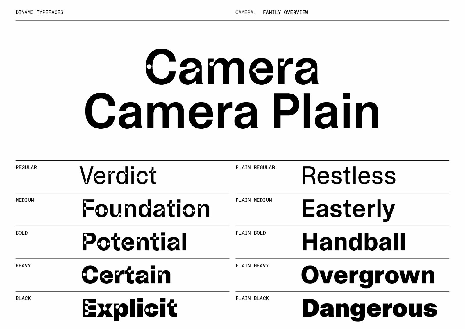 ABC Camera is a reinterpretation of light traps, which were originally used in the 60s and 70s to make text more readable on TV screens. Similar in logic to ink traps, light traps compensated for low resolution: When the font appeared, the screen’s blur filled in its holes so that each letter looked complete. The design has been orbiting around our cosmos for a long time, and it might be one of the most requested typefaces in our inbox to date. Like many of our fonts, it can be considered an “early work” of our co-founder Fabian Harb, conceptualized around Dinamo’s inception days. Light traps were such an unintentionally bold visual feature, and so we’ve scaled them up for ABC Camera, referring to them as “holes” (as in Swiss Emmental). The font is available without the holes, bringing it back to full functionality and forming an interesting typeface in its own right. Overall, ABC Camera is a neutral, toned-down grotesque similar in style to Helvetica but with freer, less strictly de...