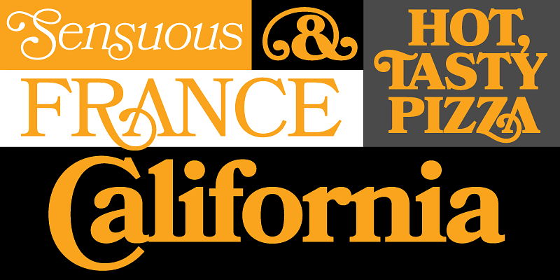 Cheesecake (2024) is an ultra-bold script inspired by lettering of the sixties and seventies. It’s a design that Mark Simonson found himself compulsively drawing during the development of Dreamboat (2022). Cheesecake is simpler and less formal—almost a caricature of the style—with a larger x-height and more extreme forms. It has an alternate to the default cursive-style lowercase “s” and a full set of dingbats. It’s keen for branding, advertising, posters, book covers, packaging, and the like.