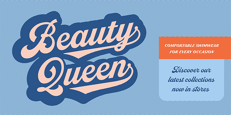 Lakeside (2008) is a flowing 1940s-style brush script, inspired by hand-lettered titles in Otto Preminger’s classic 1944 film noir movie “Laura.” Lakeside uses OpenType magic to automatically mimic real Script lettering, choosing the best letter shapes based on where they fall in a word and what letters are nearby. It also includes three sizes of capitals: Normal capitals for typical settings, tall capitals for a more elegant effect, plus a small, plain set of capitals for setting in all caps, something not usually possible with script faces.