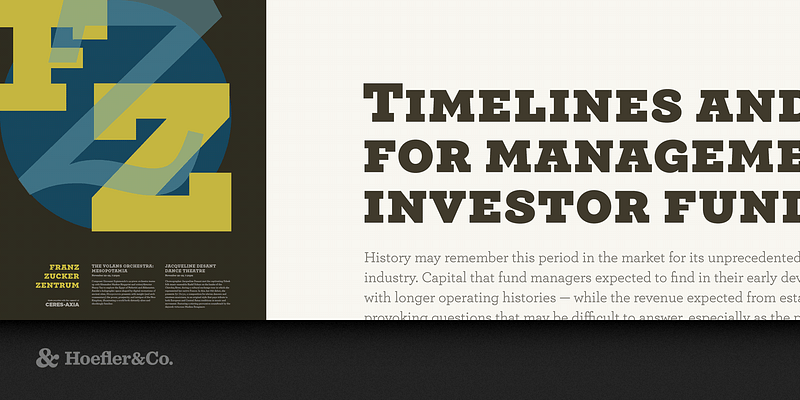 Sweet but not saccharine, earnest but not grave, Archer is designed to hit just the right notes of forthrightness, credibility, and charm. Slab serifs have been evolving for two hundred years, yet the category continues to be dominated by two basic styles: Antiques and Geometrics. Antiques arise out of the same nineteenth-century tradition that produced the Modern and Scotch styles: at heart, they’re text faces, and they feature all of the qualities needed to thrive at small sizes. (Antiques customarily have the traditional ‘two-storey’ forms of a and g, and a capital R that ends in a flourish.) Our Ziggurat typeface is an example of the Antique style in full flower, capturing the best of what the style has to offer: it’s warm, comforting, and persuasive. But this coziness comes at the expense of modernity, and in the wrong context even the best Antique can feel old-fashioned, musty, and irrelevant. The Geometric is a twentieth-century riposte to the Antique. Informed by the same kind of rationalist thinking that inspired the great sans serifs of the Bauhaus, Geometrics abandon traditional forms in favor of mathematical strategies. A Geometric’s O is circular rather than elliptical, and its forms shed their residual contrast between thicks and thins. Geometrics usually apply this same rationalism to the woollier parts of the alphabet, replacing the alphabet’s beaks and tails and ball terminals with a program of matching serifs. While these faces can sometimes be bracingly modern, they’re often monotonous, and many Geometrics suffer from an astringent sting that makes them difficult to use and unwelcome to When Martha Stewart Living asked us to develop a new typeface for the magazine, it seemed that a slab serif could answer much of the brief. A slab could be personable, straightforward, and credible, though it would take special effort to also make it pretty, hard-working, and frank. Archer would have to answer some formidable typographic demands, since Living is an almanac of lists, recipes, charts, diagrams, tables, calendars, and glossaries. To make the typeface frank — direct, but not brusque — we introduced subtle cues from the world of typewriter faces, which combine the ordinariness of Antiques with the modern practicality of Geometrics. We restored the vanished ‘ball terminals’ to the lowercase, and uncharacteristically applied these gestures to the capitals as well, in order to yield a font that’s friendly without being silly, and attractive without being flashy. The result is a typeface that’s well-mannered, easy to work with, and inviting to The Archer typeface was designed by Jonathan Hoefler and Tobias Frere-Jones in 2001, with contributions from Jesse Ragan and additional material by Jordan Bell and Andy Clymer. While rooted in the ‘geometric slab serif’ style that emerged in the early nineteenth century (and reached full flower a century later), Archer’s many liberties with the style include its uncharacteristic application of ‘ball terminals’ to capital letters such as ‘C’ and ‘S,’ a detail traditionally found only in the lowercase alphabet. Archer was created for Martha Stewart Living, in whose pages the typeface first appeared in 2001.