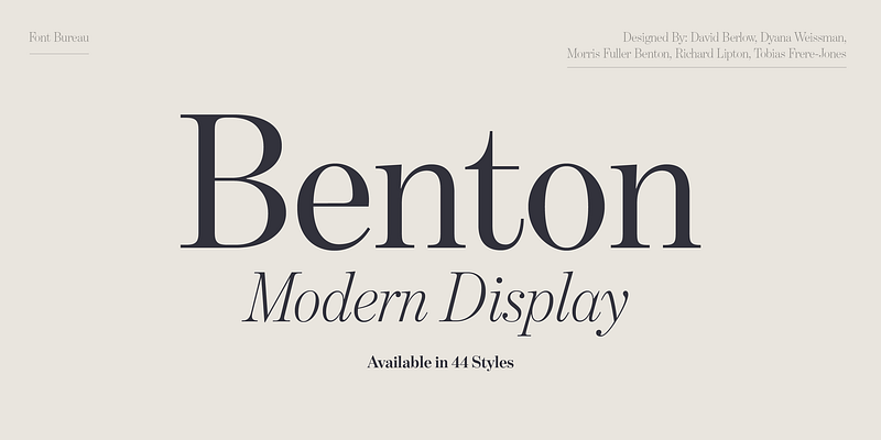 Benton Modern was first prepared as a text face by Font Bureau for the Boston Globe and the Detroit Free Press. Design and proportions were taken from Morris Fuller Benton’s turn-of-the-century Century Expanded, drawn for ATF, faithfully reviving this epoch-making magazine and news text roman. The italic was based on Century Schoolbook. The display cuttings were prepared by Dyana Weissman and Richard Lipton; FB 2008 For additional license options like app and enterprise, visit Benton Modern Text on [Type Network](https://store.typenetwork.com/foundry/fontbureau/fonts/benton-modern-text).