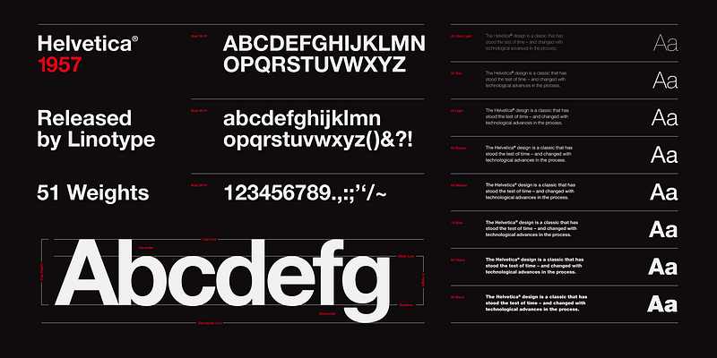 With the name Helvetica (Latin for Swiss), this font has the objective and functional style which was associated with Swiss typography in the 1950s and 1960s. It is perfect for international correspondence: no ornament, no emotion, just clear presentation of information. Helvetica is still one of the best selling sans-serif fonts.